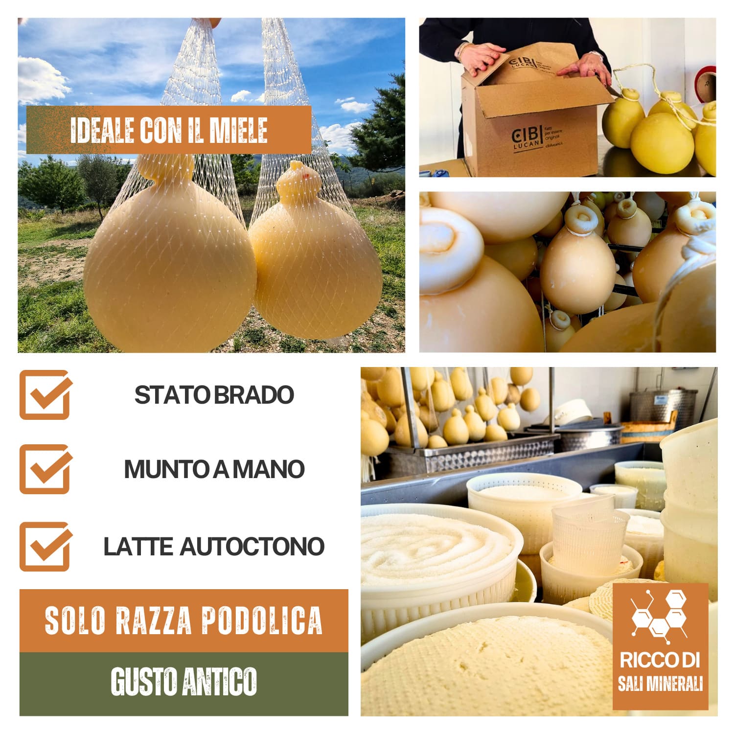 Il Caciocavallo podolico lucano รจ un formaggio a pasta filata prodotto esclusivamente con latte vaccino di vacca podolica. Di colore giallo paglierino intenso, il caciocavallo podolico ha una crosta sottile e liscia, il suo interno cambiaย  in base alla stagionatura. Ricco di vitamine, sali minerali, proteine e grassi, presenta note aromatiche e un sapore dolce e delicato. Prodotto a chilometro zero, dal pascolo alla trasformazione. Latte 100% lucano da vacche podoliche allo stato brado. Stagionatura naturale in grotta.