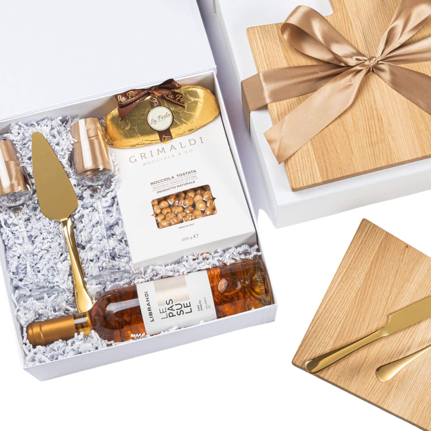 Avvolta nelle sfumature luminose del bianco e dell’oro, questo elegante regalo trasforma un semplice momento in un’esperienza sensoriale completa. Il cuore della box è un raffinato vino passito “Le Passule”, perfetto per accompagnare le nocciole di Giffoni, esaltandone le note aromatiche. Il tutto servito con eleganza su un pregiato tagliere in rovere, utilizzando coltelli dorati da dessert e versando il vino in due sofisticati bicchieri da passito.