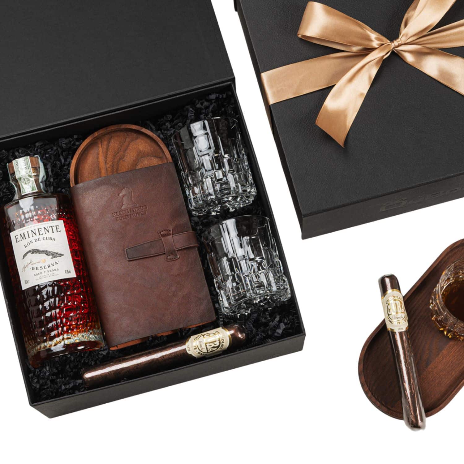Gentleman’s Club è l’ideale per chi ama prendersi il proprio tempo e viverlo con intensità. Il protagonista è Eminente Reserva 7 anni, pregiato rum cubano dall’anima avvolgente, servito in una coppia di bicchieri tumbler di design. Il tutto poggia su un elegante vassoio in legno termo-trattato, perfetto per accompagnare il rituale del dopocena. Ad affiancarlo, un sigaro di cioccolato fondente, aromatico e strutturato. E per custodire pensieri, appunti e ispirazioni: un taccuino in pelle dallo stile vintage, simbolo di classe e concretezza. Un’esperienza di gusto, materia e carattere.