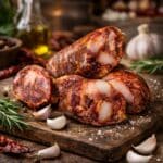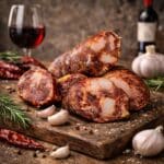 Ingredienti: Carne di suino, semi di finocchietto selvatico, polvere di peperone dolce, aglio fresco e sale.