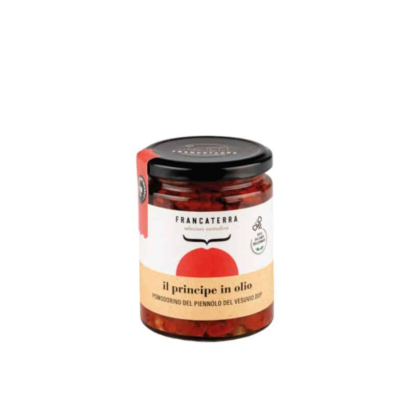 Pomodorino del Piennolo del Vesuvio DOP essiccato e conservato in olio di semi di girasole. Questa tipologia di pomodori veniva tradizionalmente raccolta a grappolo e appesa ai balconi. ร cosรฌ che prende il nome di Piennolo, che in napoletano vuol dire pendolo.