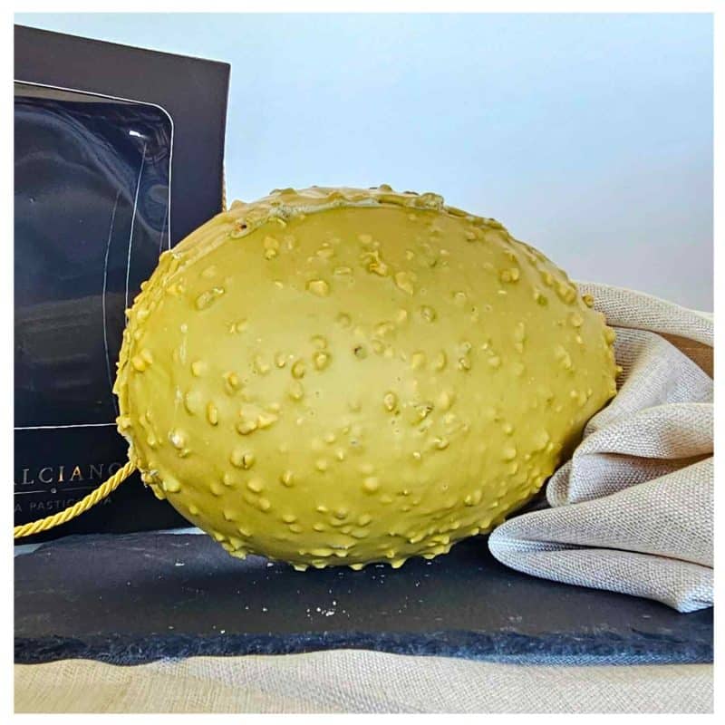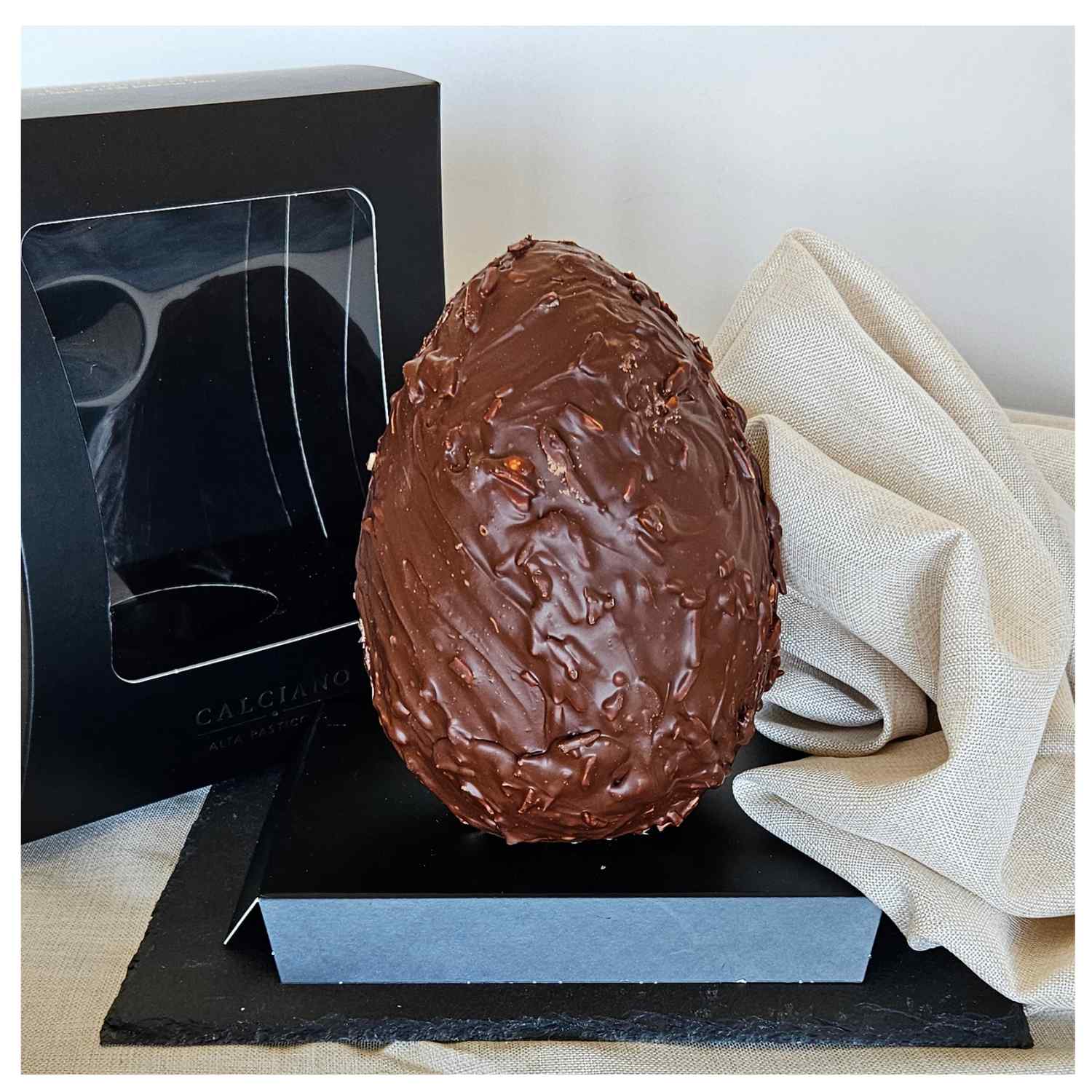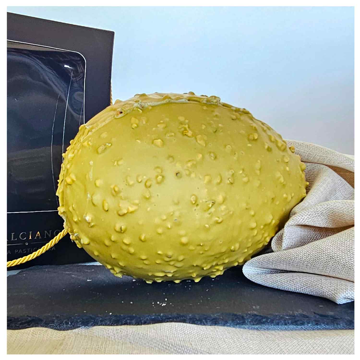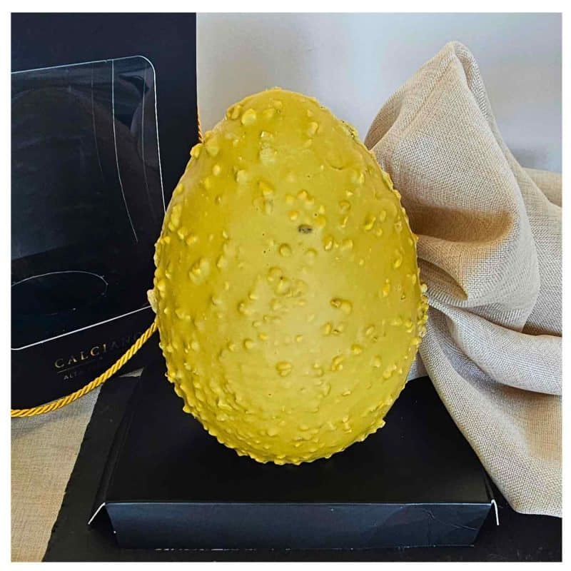 Uovo di finissimo cioccolato al pistacchio con pralinato e granella di pistacchio della pasticceria Calciano