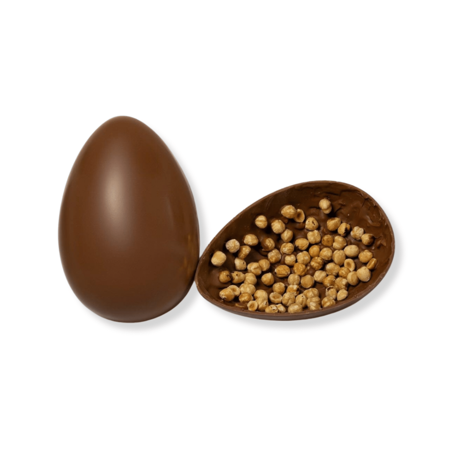 Uovo con finissimo cioccolato al latte con pralinato e granella di nocciola.