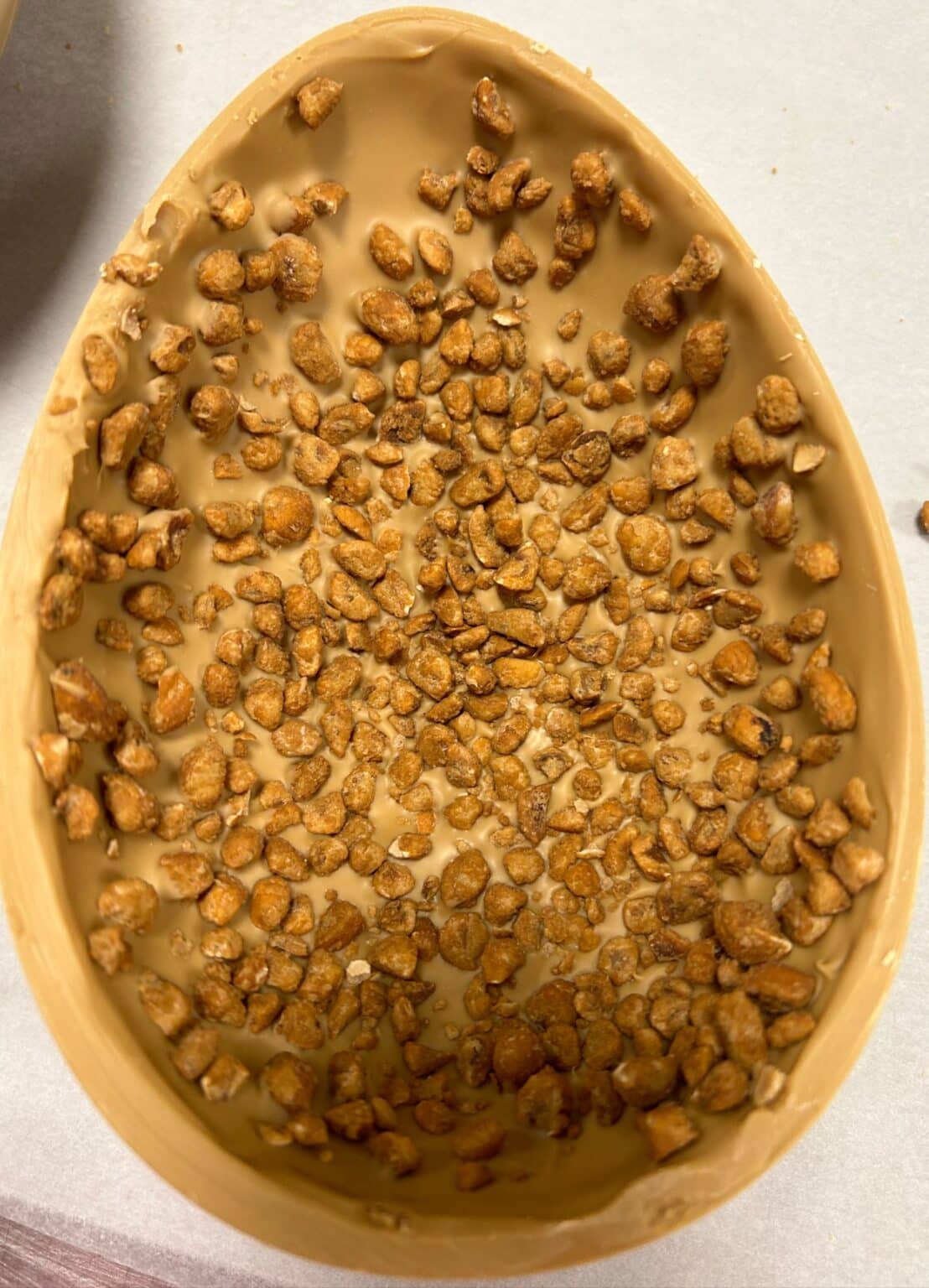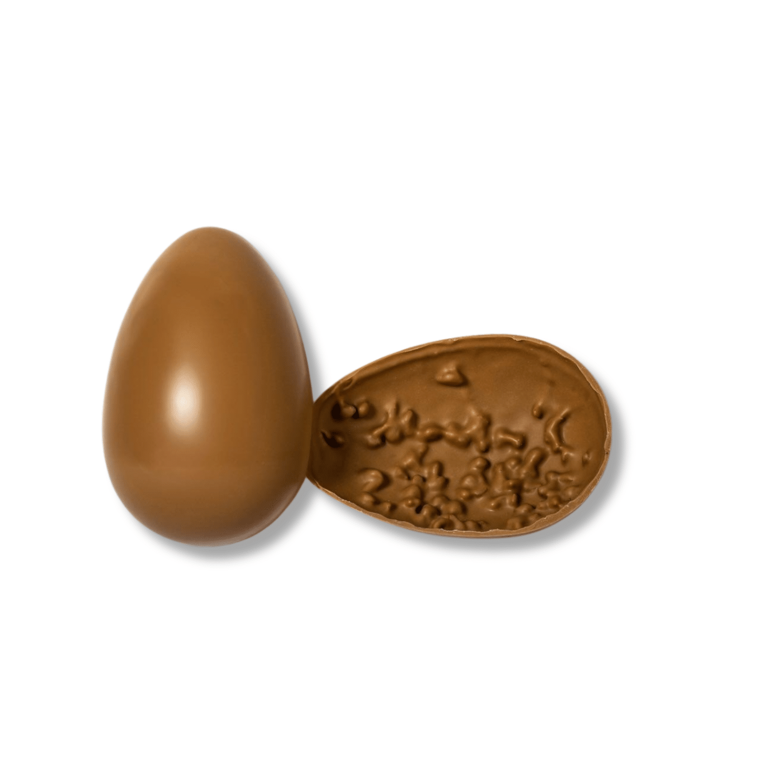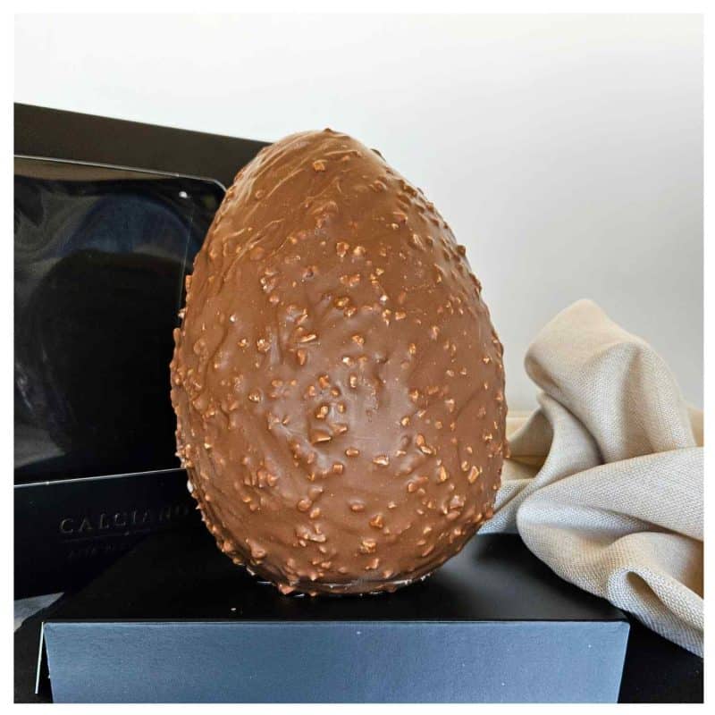 Uovo con finissimo cioccolato al caramello e granella di nocciola caramellata.
